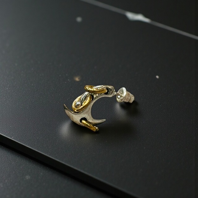 ※送料無料!! ⚫︎サイズ:18G ⚫︎幅: 縦 約15mm × 横 約3mm ⚫︎厚み:約4mm ⚫︎素材:シルバー925(スターリングシルバー) 鋭さと曲線美を併せ持つ、クロー(爪)モチーフのシルバー925ピアス! 重厚感のあるシルバーボディに、ゴールドカラーのリングパーツを組み合わせたコンビデザインが、耳元に強い個性と存在感を与えます。 クロー(爪)は「力」「守護」「本能」を象徴するモチーフ。 ロック・ストリート・バイカースタイルはもちろん、シンプルなコーデのアクセントとしても映える一本です。 シルバー925ならではの経年変化(エイジング)も楽しめ、使い込むほどに味わいが増します。 片耳販売のため、左右非対称コーデや重ね付けにもおすすめです。 シルバー925について…… シルバー925は、92.5%の純銀を含む高品質な素材。 耐久性に優れ、変色しにくく長期間にわたってご愛用いただけます。また、アレルギーの心配も少ないため、安心してお使いいただけるアクセサリーです。 シルバーピアス,シルバー925,クロー ピアス,爪モチーフ,フックモチーフ,ストリートアクセサリー,ロックアクセサリー,バイカーアクセサリー,ヒップホップジュエリー,ユニセックスアクセサリー,メンズピアス,レディースピアス,個性派アクセサリー,シルバーアクセサリー,ゴールドコンビ,片耳ピアス,ハードアクセサリー,BigPAPA14factory,925ピアス,プレゼントアクセサリー