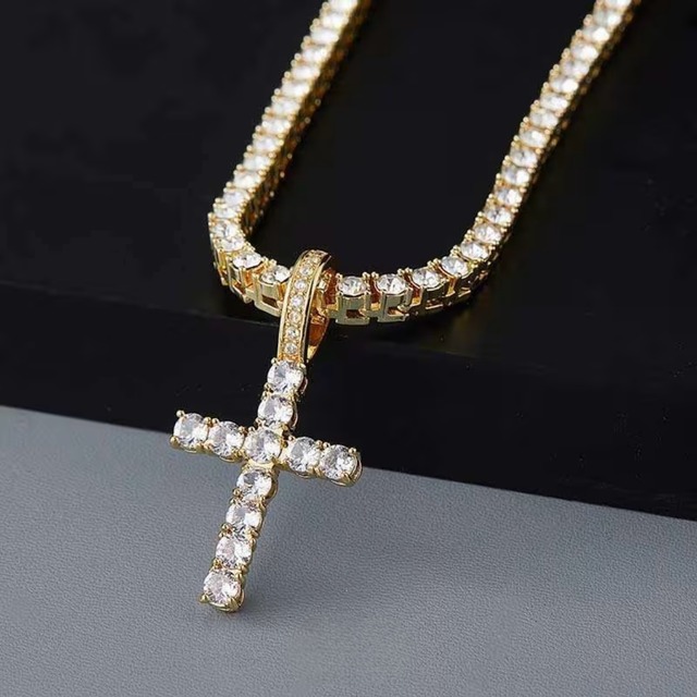 送料無料 クロスペンダント テニスチェーン付 60cm 50cm 45cm 幅4mm テニスネックレス ゴールド ネックレスチェーン ゴールドネックレス CZダイヤモンド ブリンブリン ヒップホップ HIPHOP ストリート ラグジュアリー