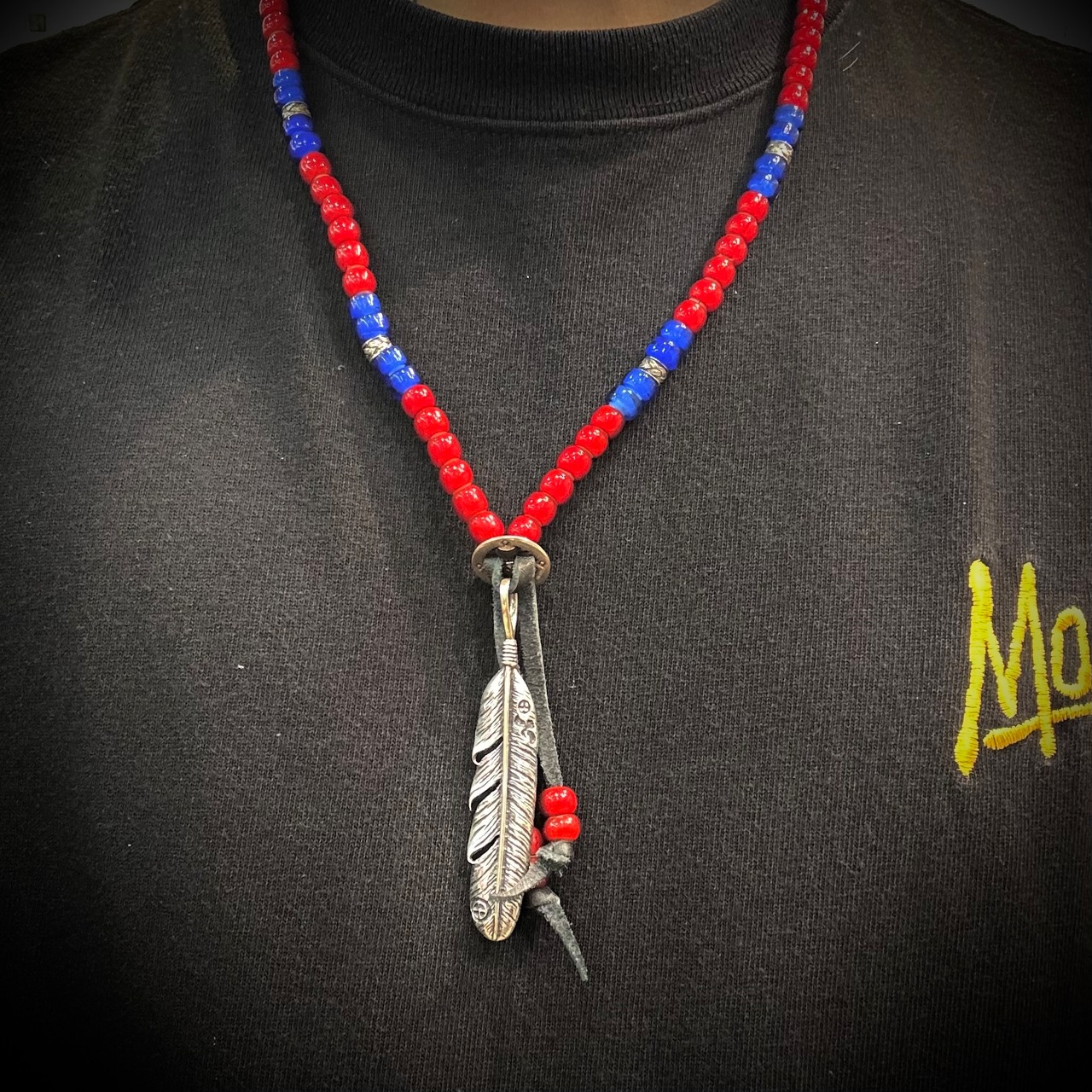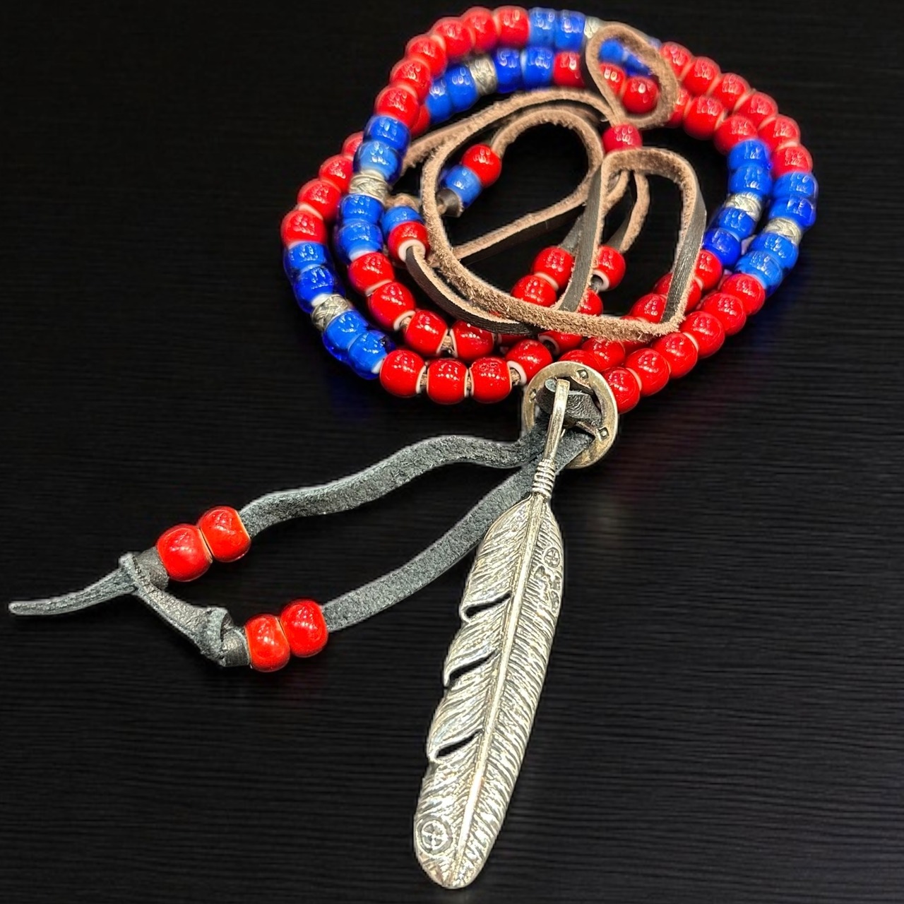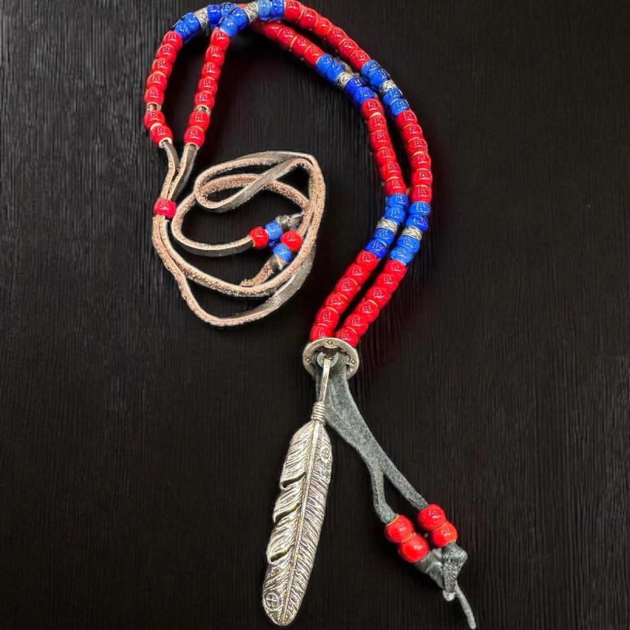 ネイティブアメリカン風デザインのフェザートップが印象的なビーズネックレスです。