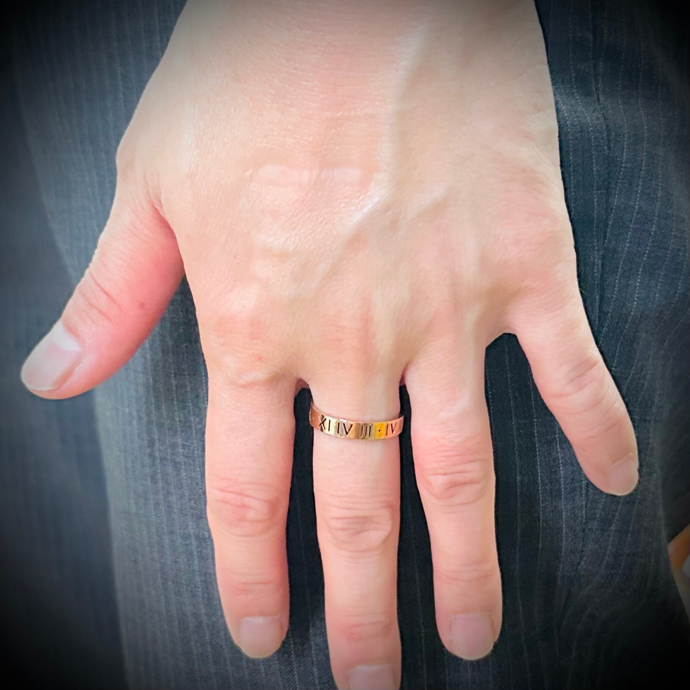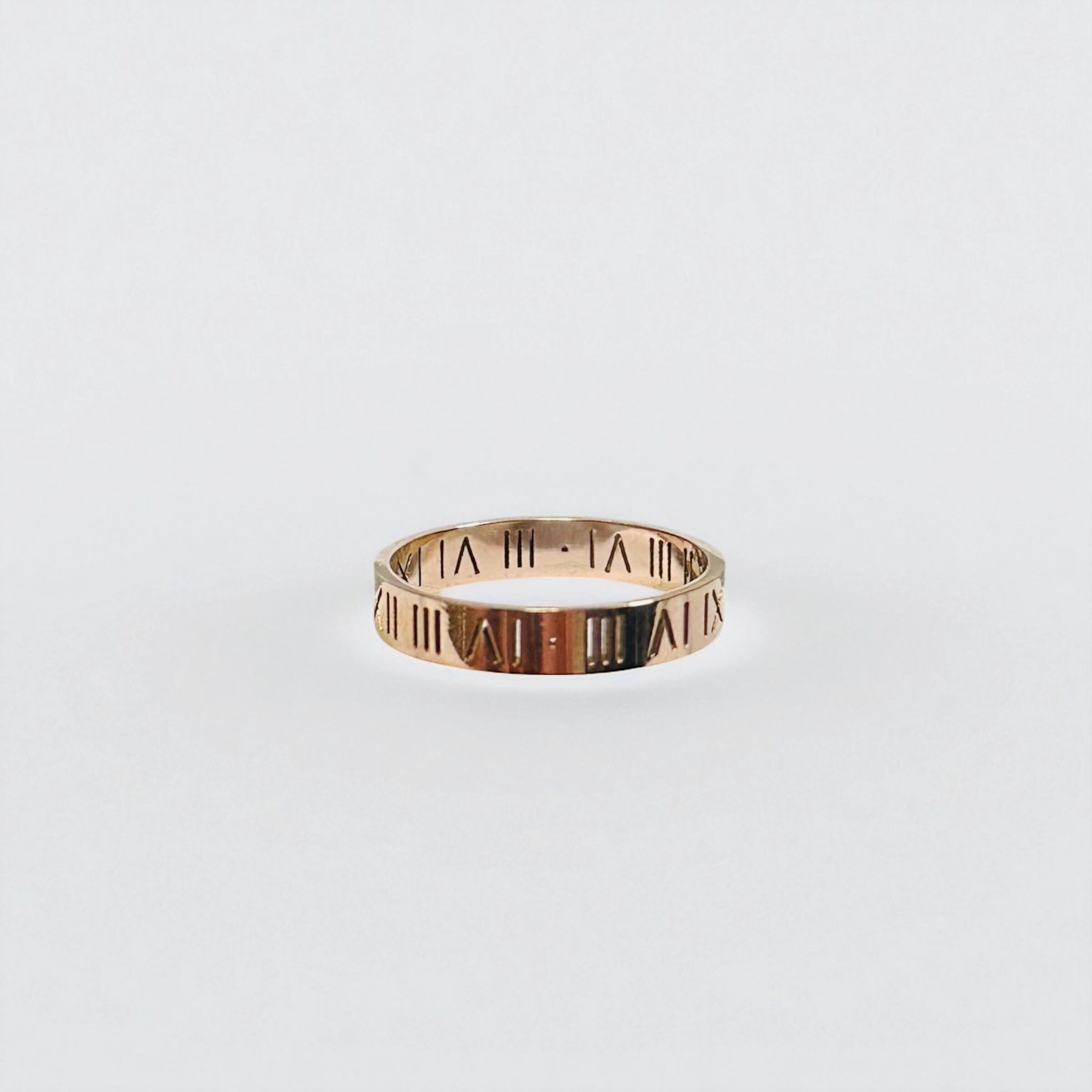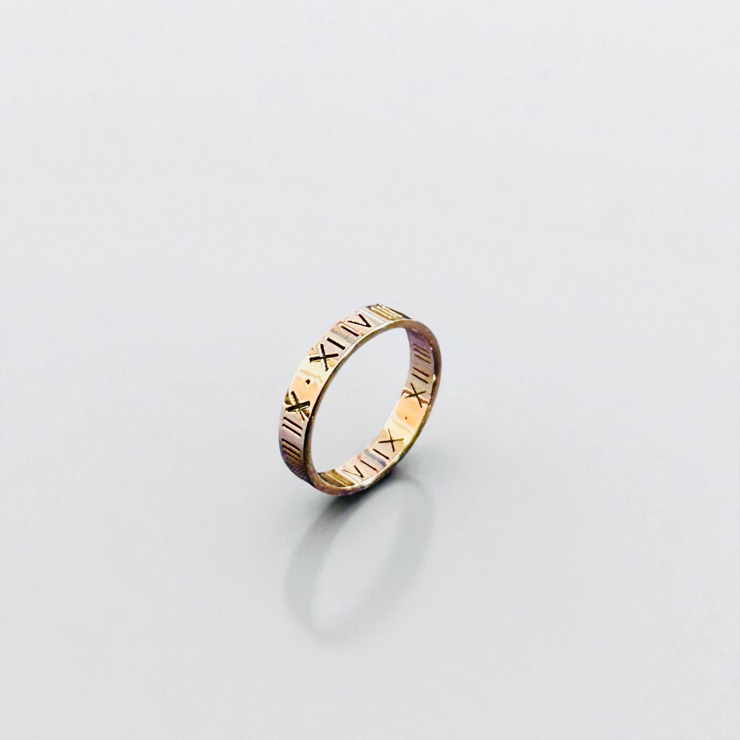 クラシックなローマ数字が刻まれた、ステンレス製のシンプルリングです。
