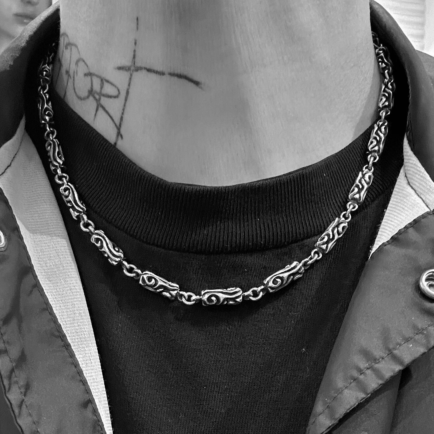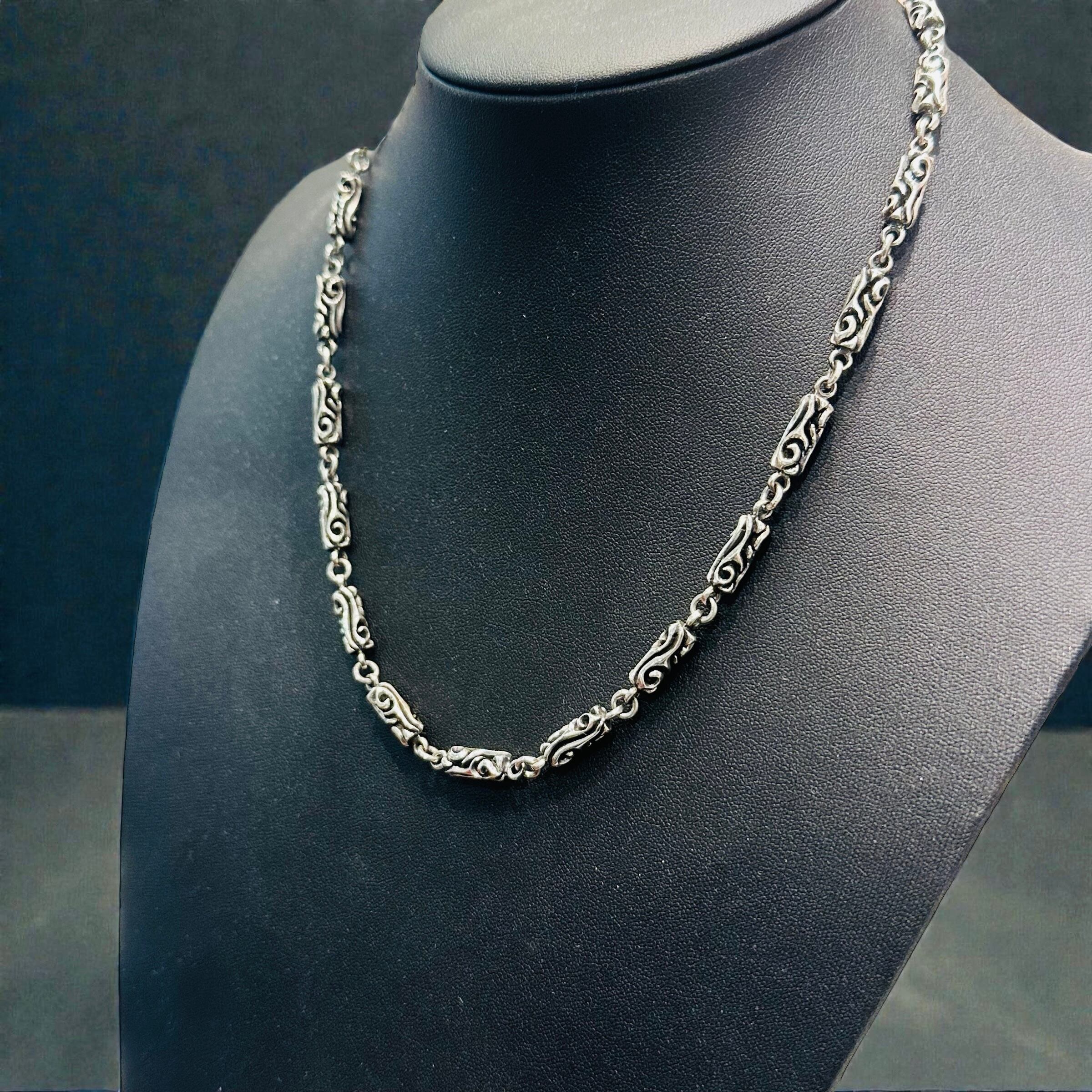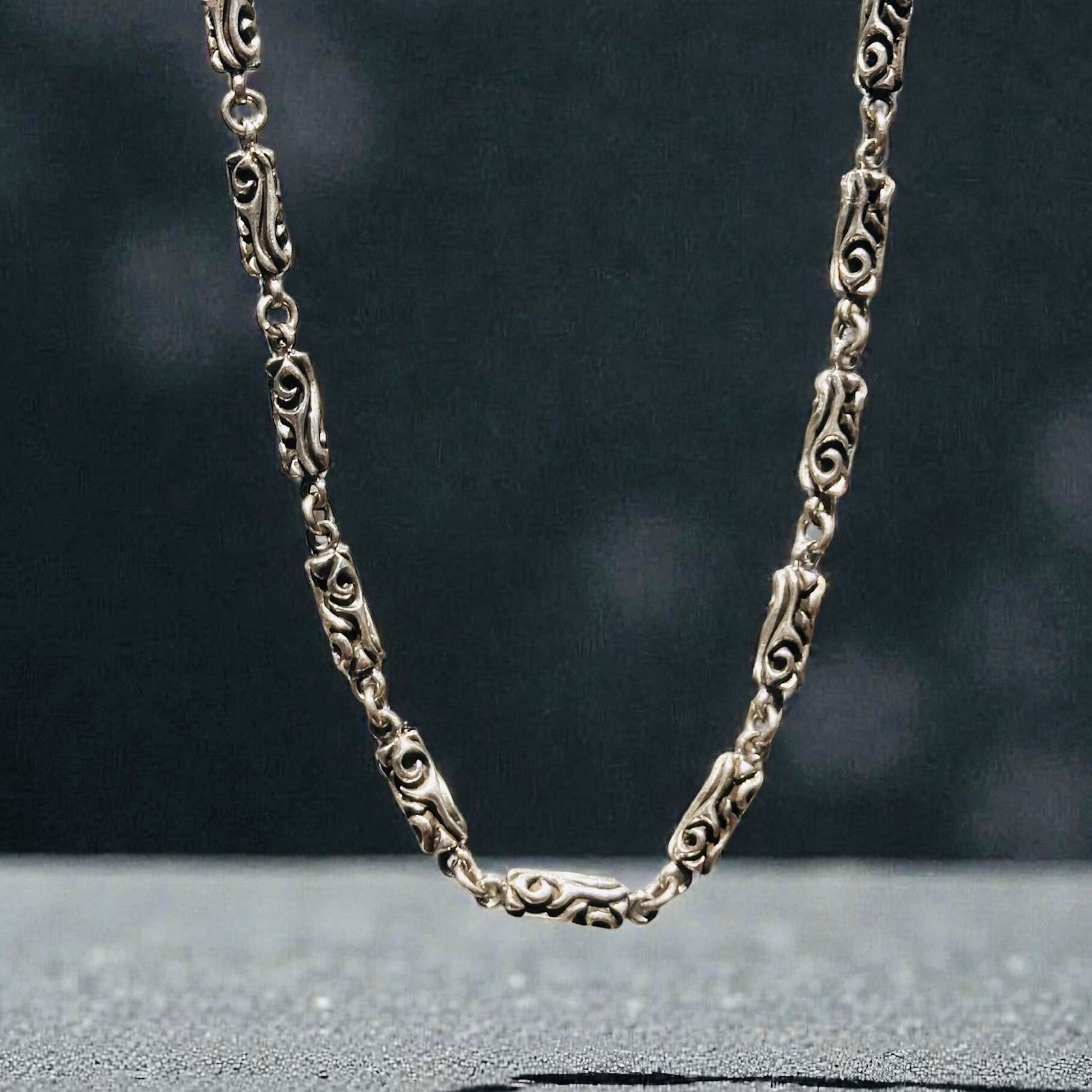 重厚感のあるバレル(筒)型リンクに、繊細な彫刻を施したシルバー925チェーンネックレス。
