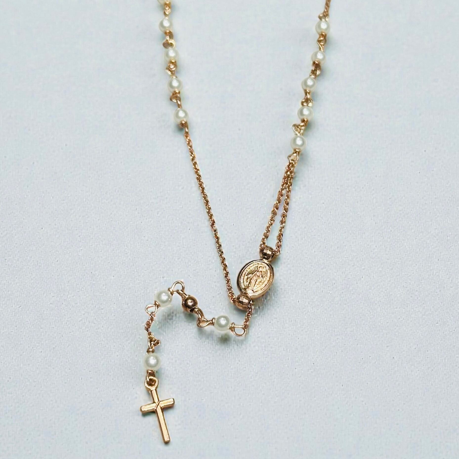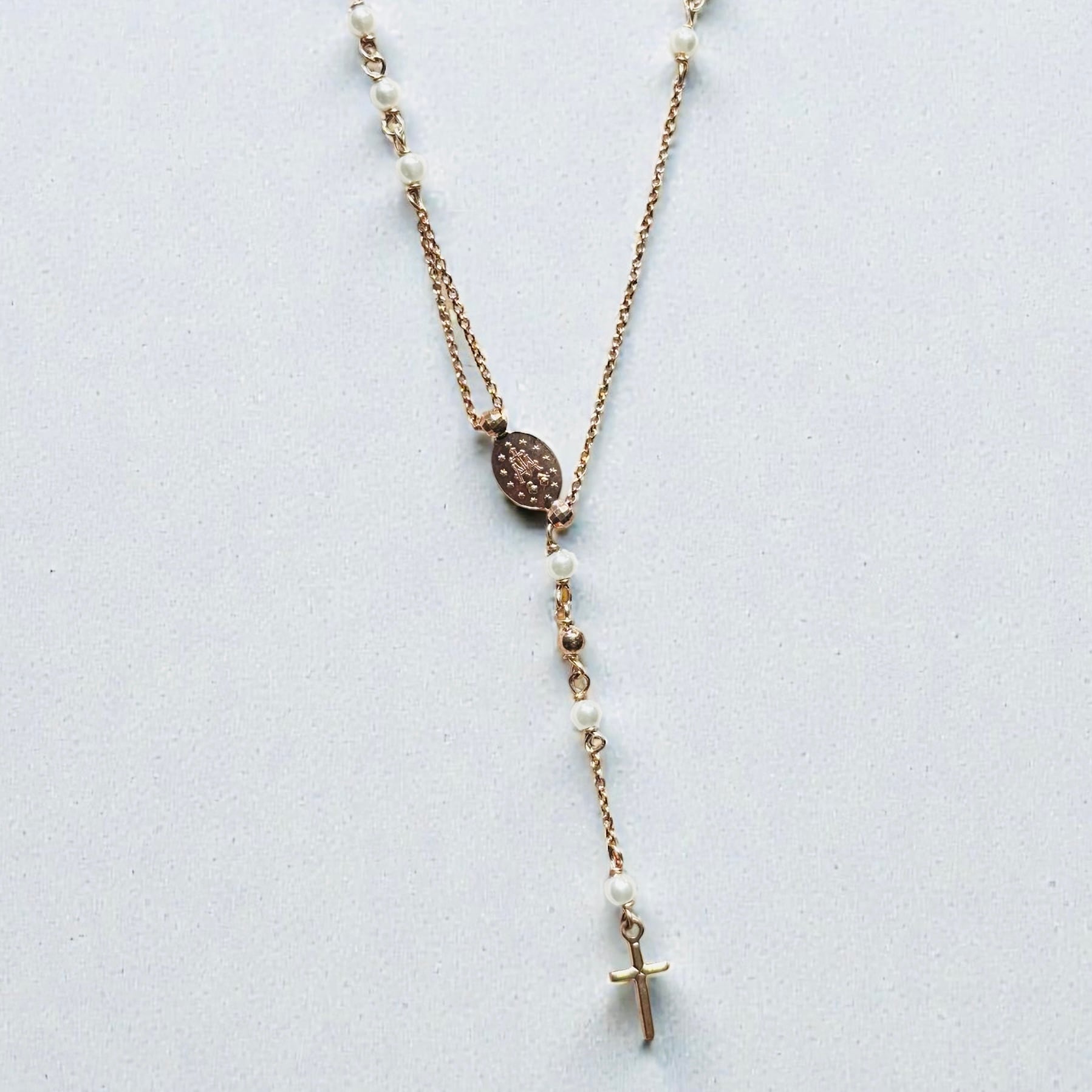 上品な輝きのパールと、神聖な雰囲気を纏うメダイ&クロスを組み合わせた、繊細なロザリオネックレス。