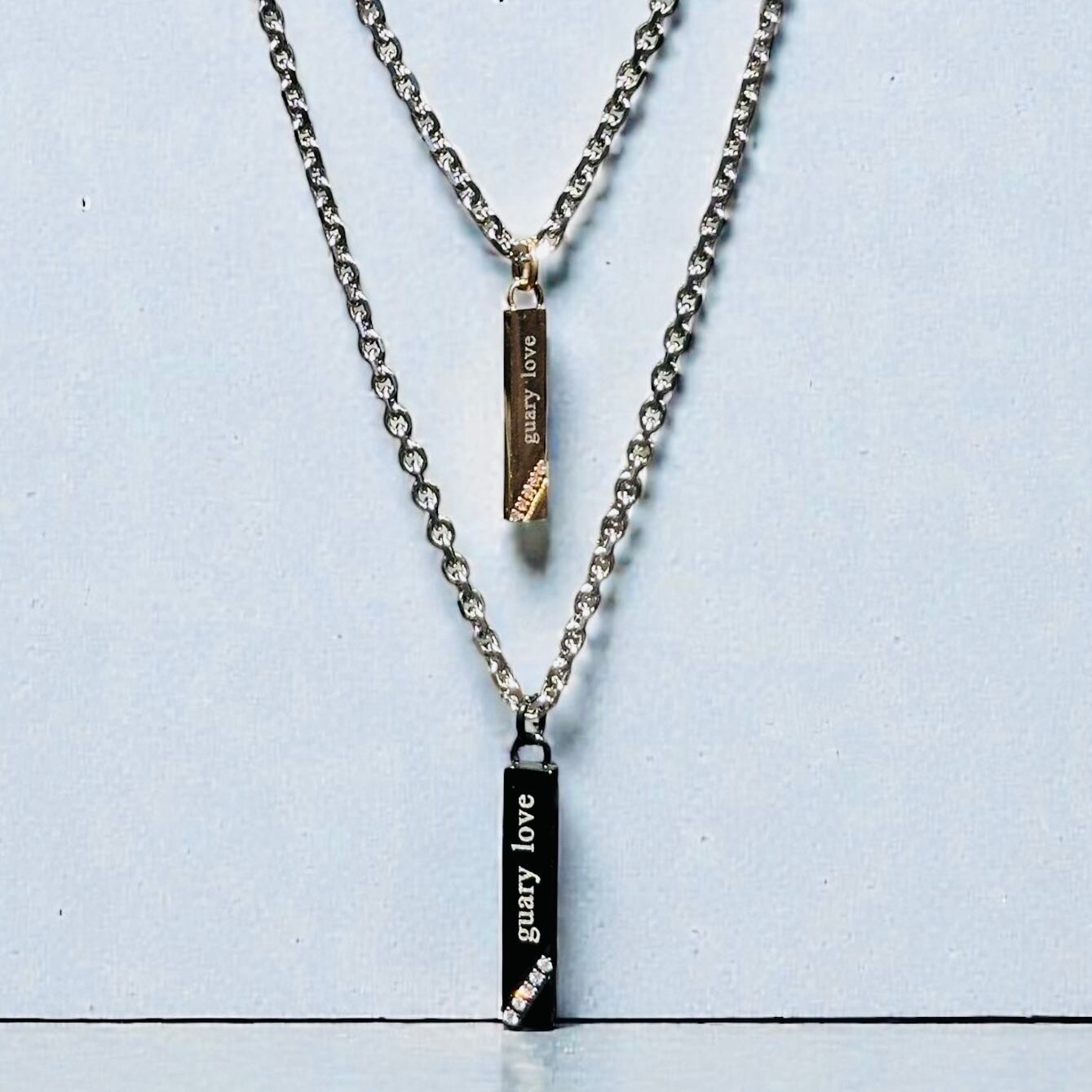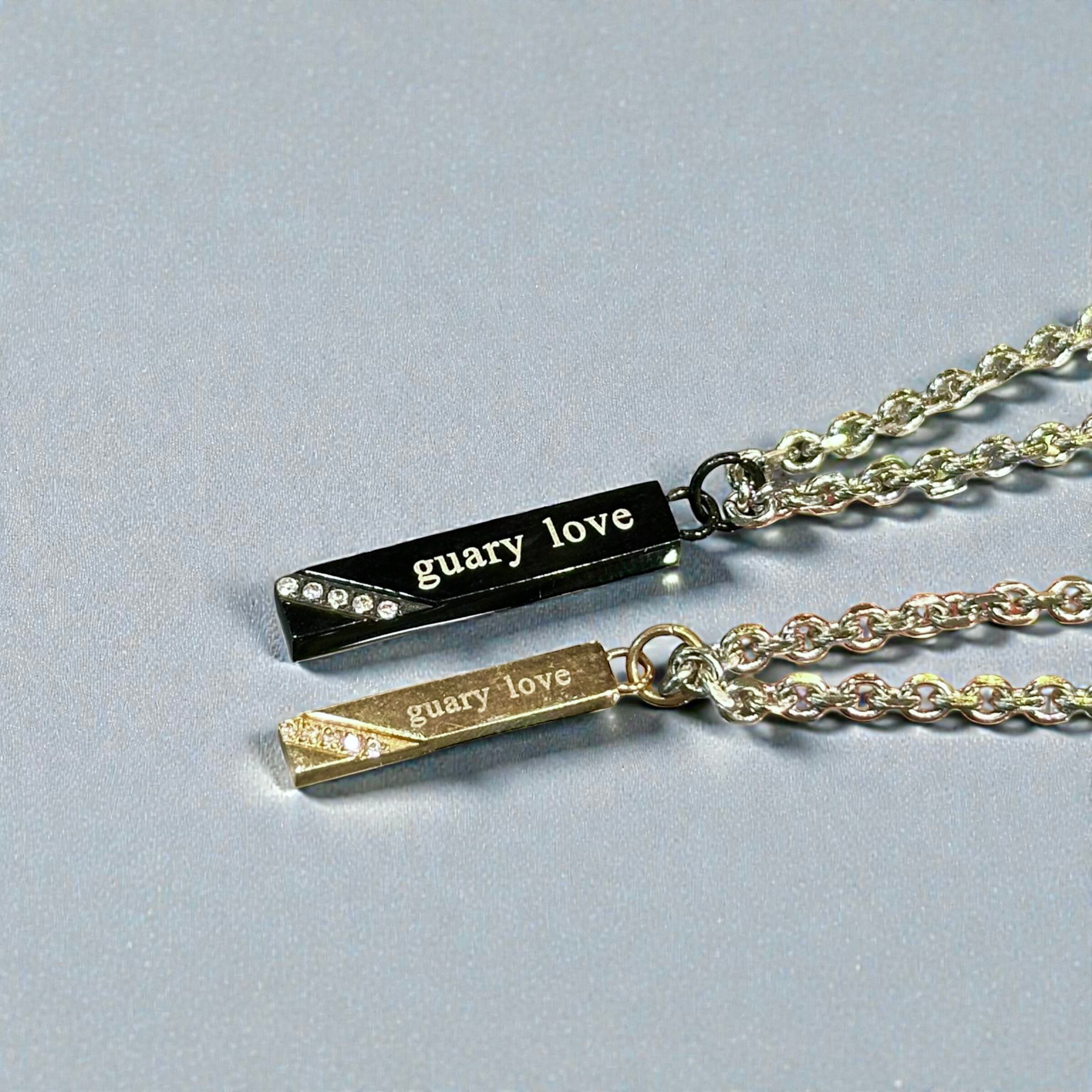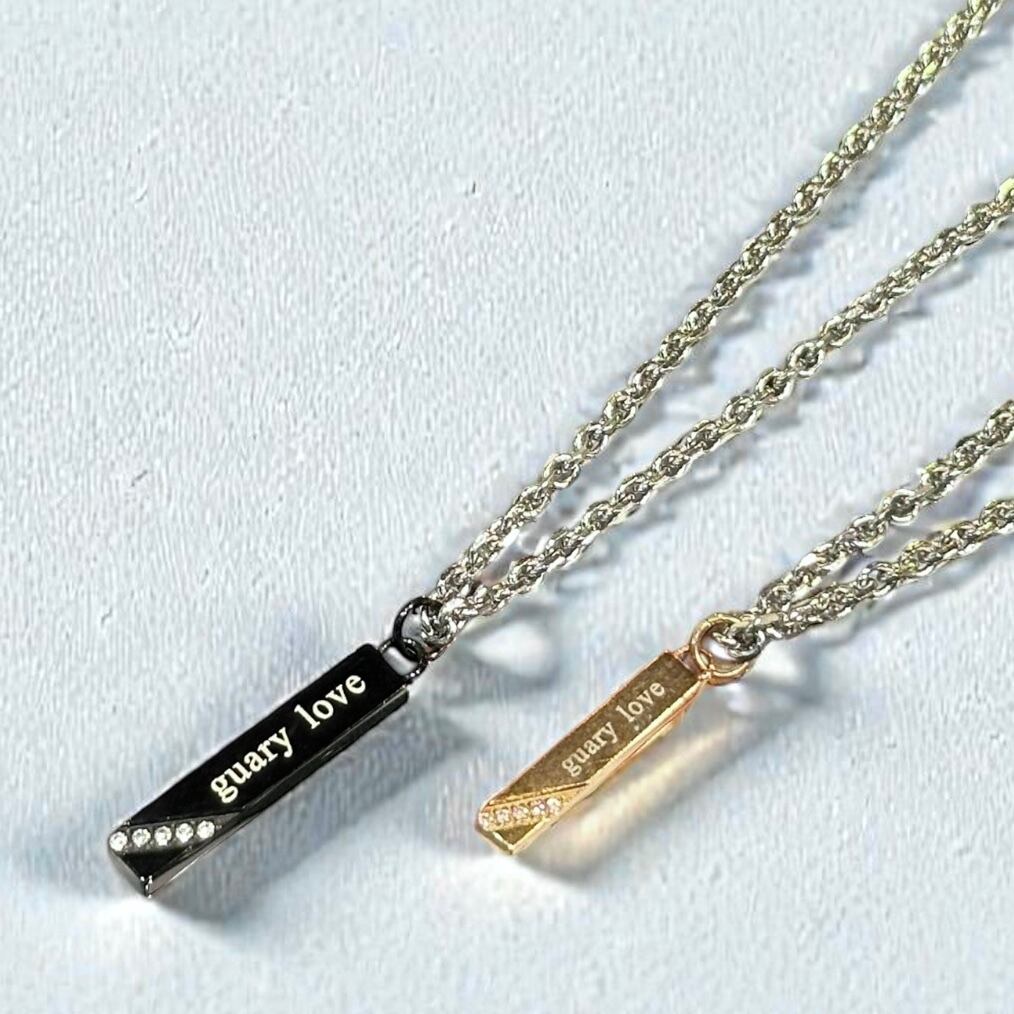 送料無料 ステンレスペアネックレス 50cm&40cmサージカルステンレス 金属アレルギー対応 ネックレス プレート シンプル アクセサリー バーペンダント guary love ロゴ刻印 ブラック&ゴールド ジルコニア入り カップル お揃い 大人ストリート