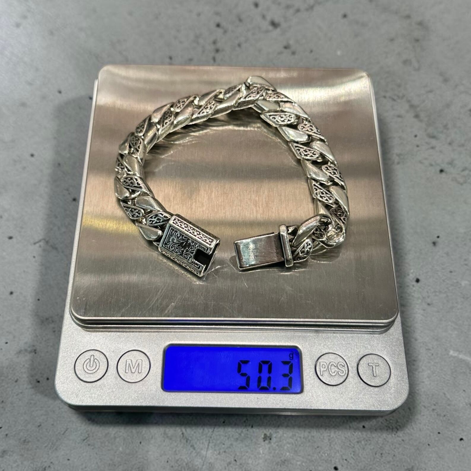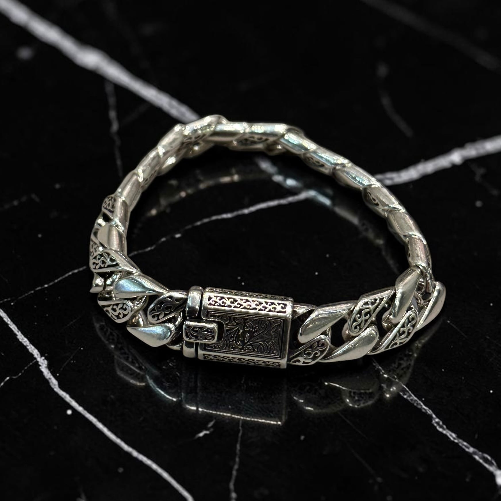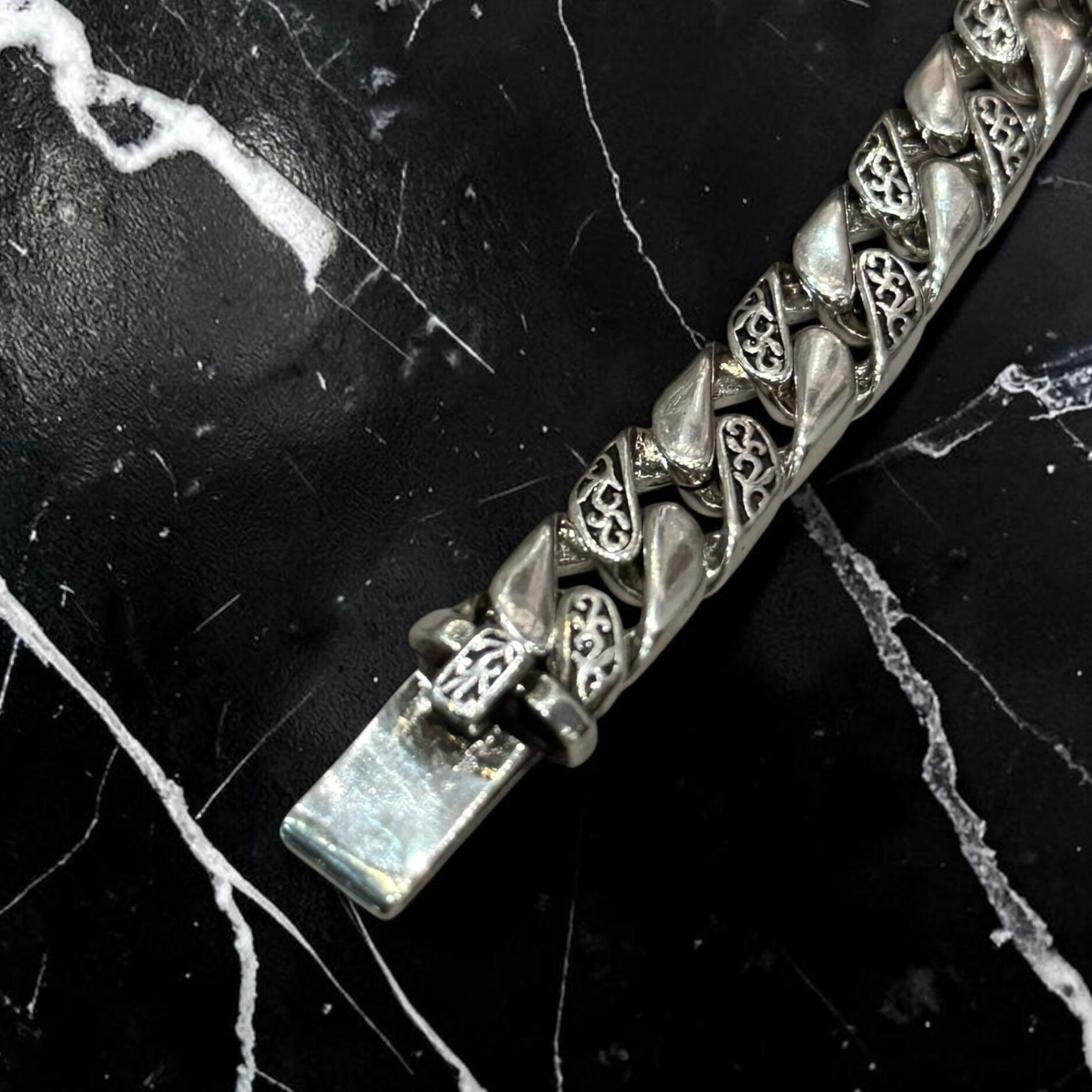 送料無料 シルバーデザインチェーンブレス 20cm 幅12mm メンズ ブレスレット アラベスク トライバル 刻印デザイン 喜平 ストリート ロック 重厚感 無骨 韓国ファッション カジュアル アクセサリー 手元映え プレゼント ギフト