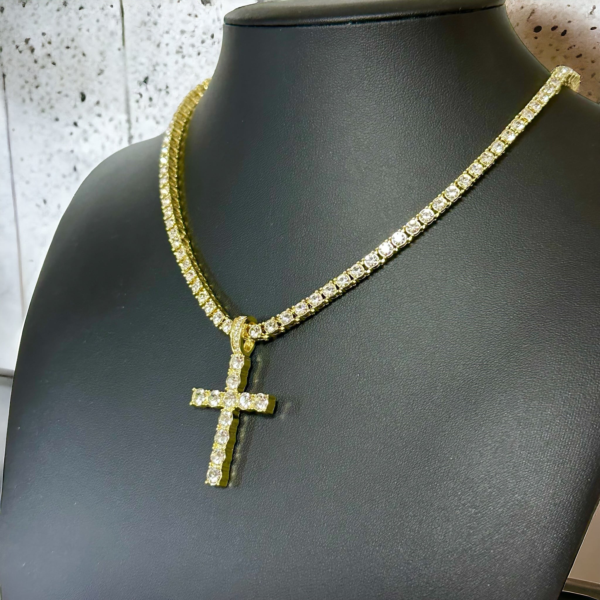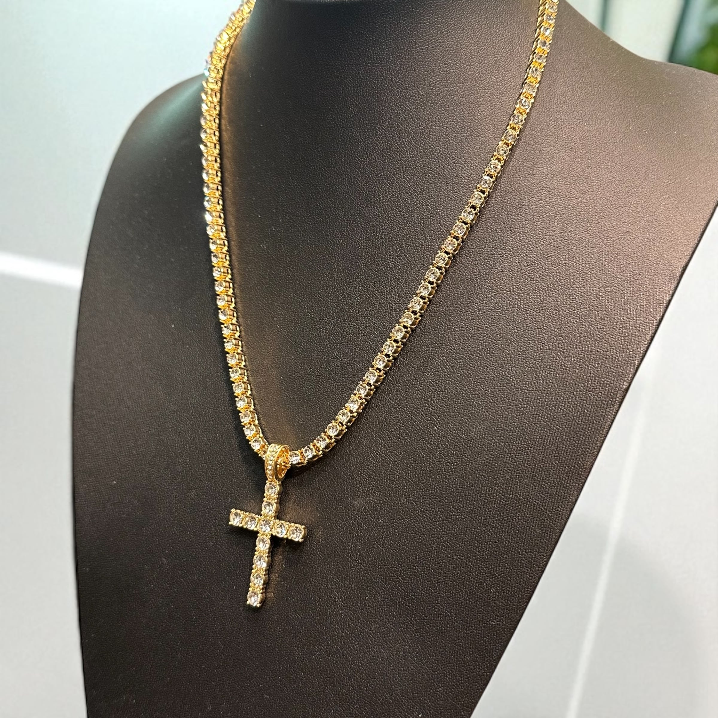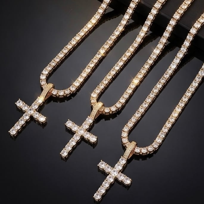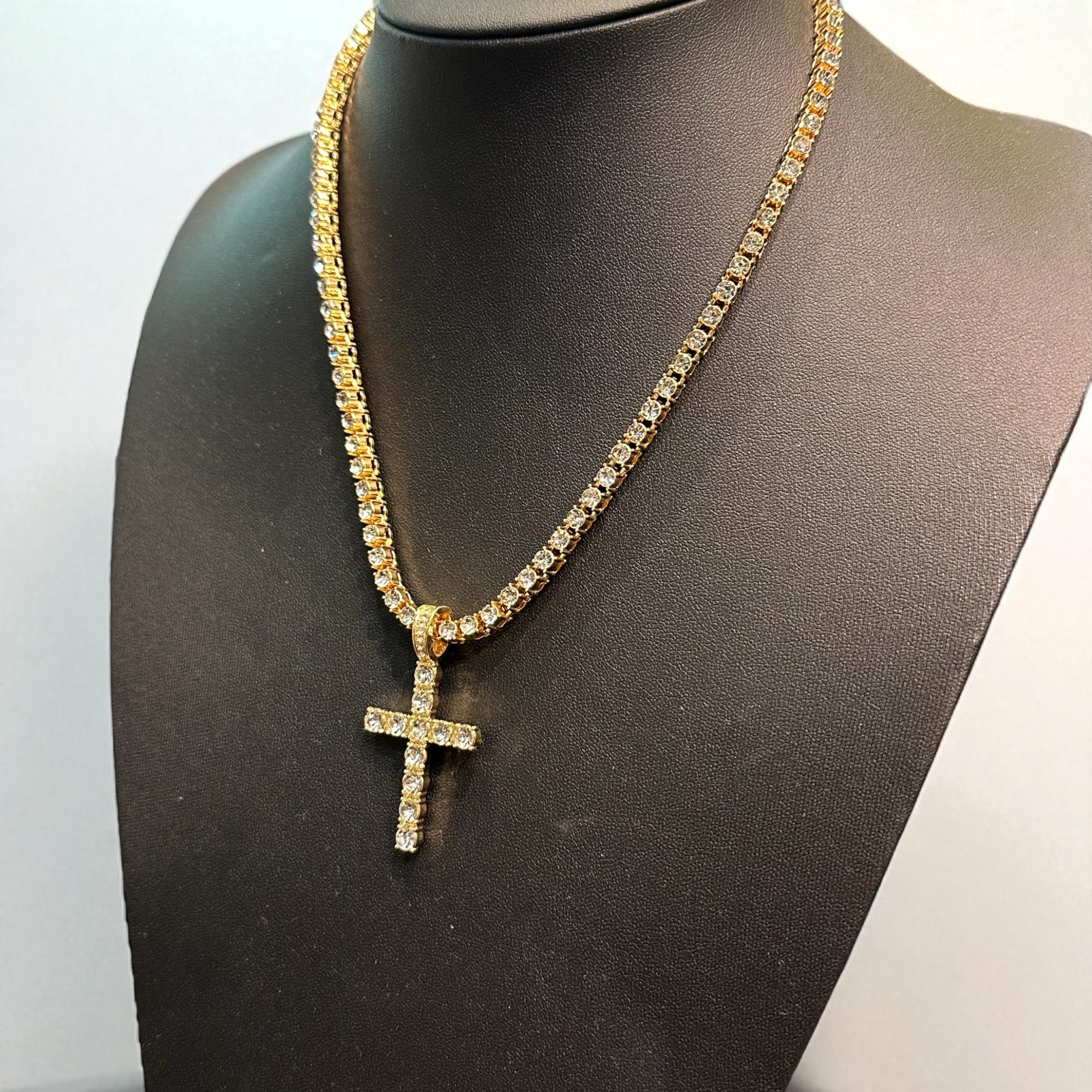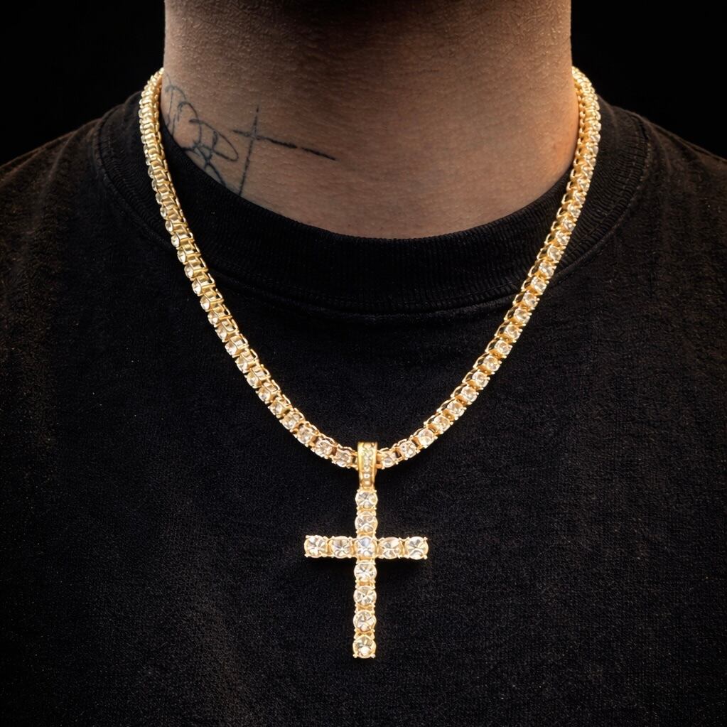 送料無料 クロスペンダント テニスチェーン付 60cm 50cm 45cm 幅4mm テニスネックレス ゴールド ネックレスチェーン ゴールドネックレス CZダイヤモンド ブリンブリン ヒップホップ HIPHOP ストリート ラグジュアリー