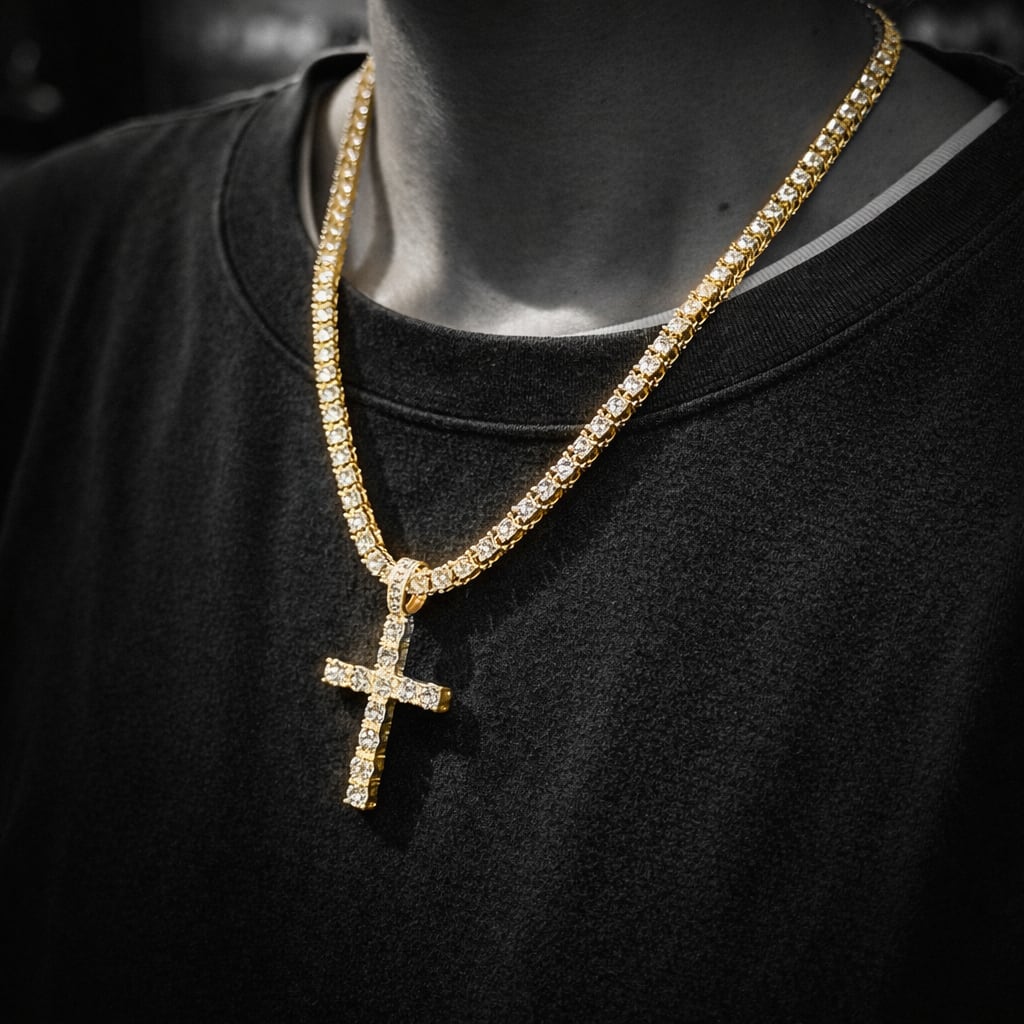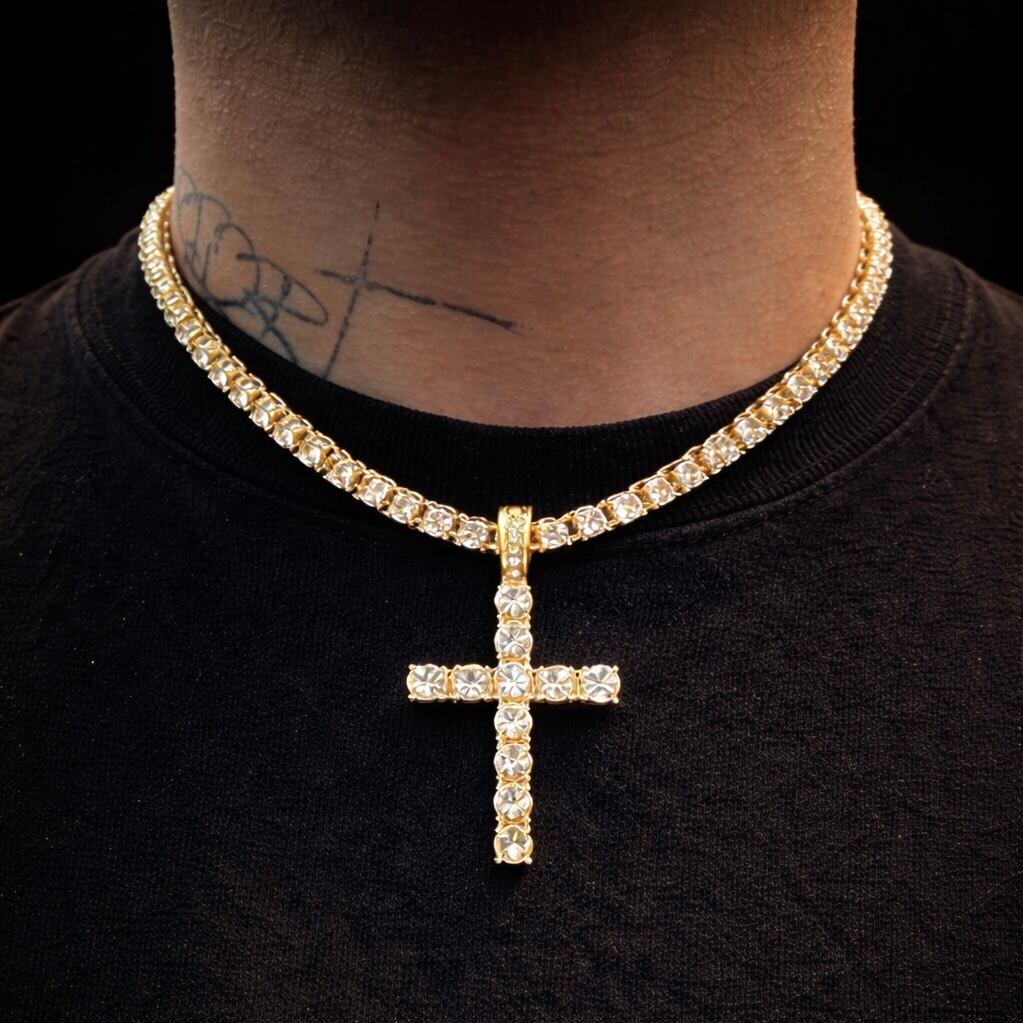 テニスチェーンネックレス クロスペンダント 18kgp ゴールドコーティング CZダイヤ ジルコニア ストリートジュエリー ヒップホップジュエリー B系アクセサリー メンズネックレス レディースネックレス ユニセックス 高級感 きらきら ラグジュアリー ラッパースタイル 韓国ファッション ダンサーアクセ 舞台衣装 パーティーアクセサリー 重ね付けネックレス ギフト プレゼント